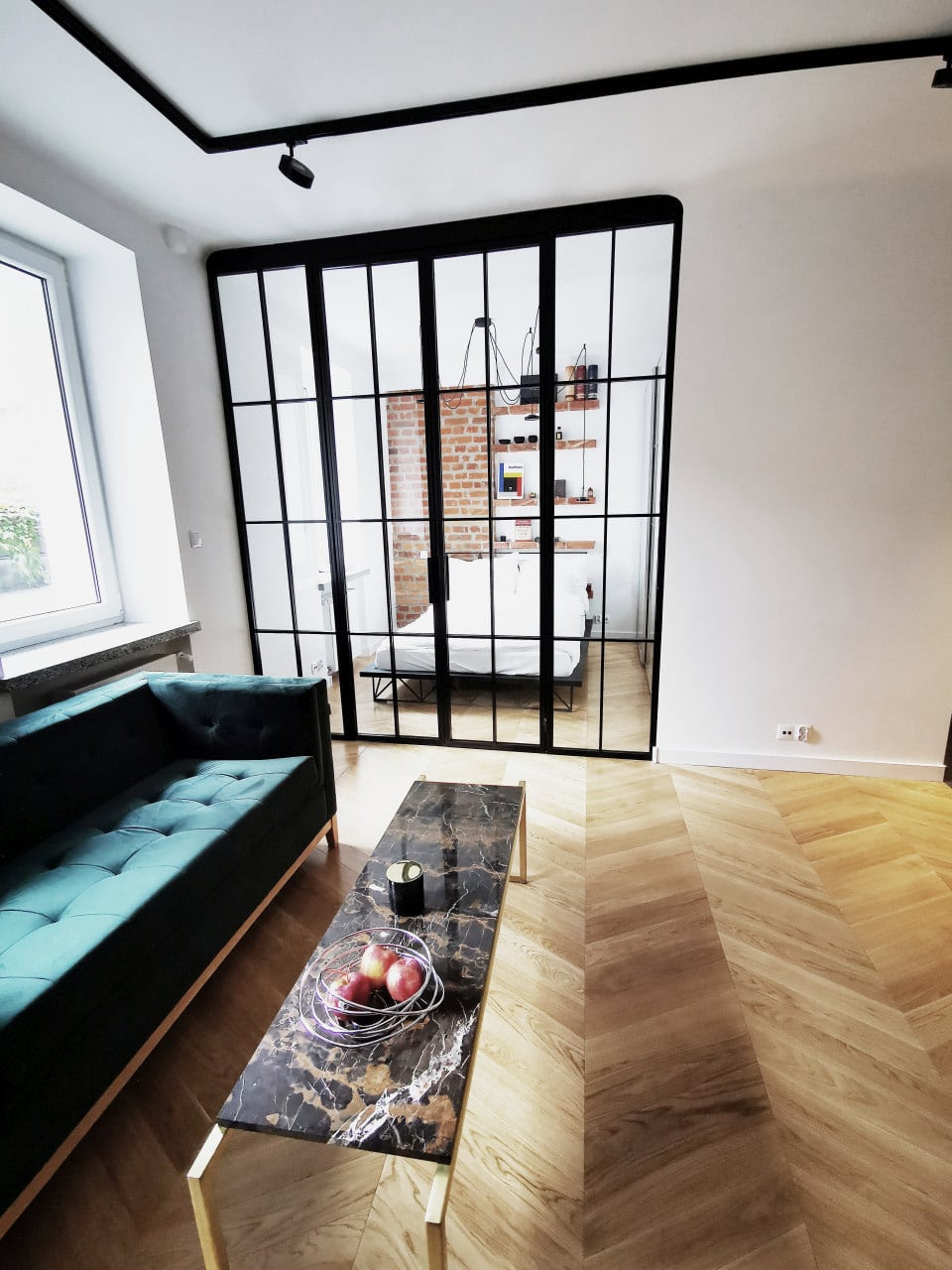 Black steel-framed room dividers with grid patterns creating bold architectural statements reminiscent of warehouse conversions.