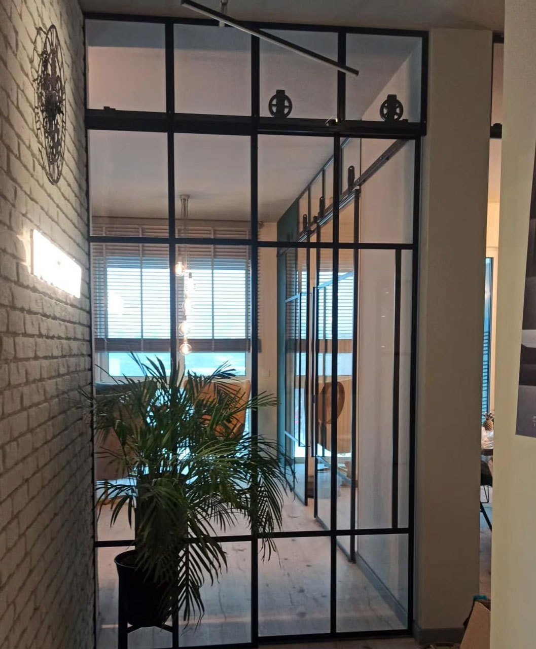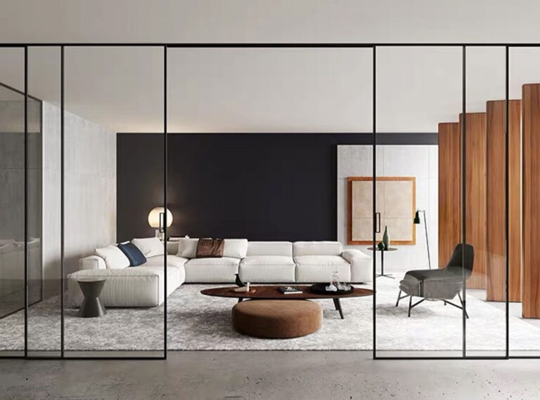 Floor to ceiling glass room dividers with minimal frames creating modern aesthetic perfection and maximum light transmission.